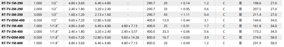 | RT-TV-1M-220 | 1.000 | 8.0 | 1/2″ | 4.80 x 3.60 | 6.40 x 4.80 | - | 218.2 | 20 | < 0.09 | 1.2 | C | Yes | 212.0 | 27.0 |