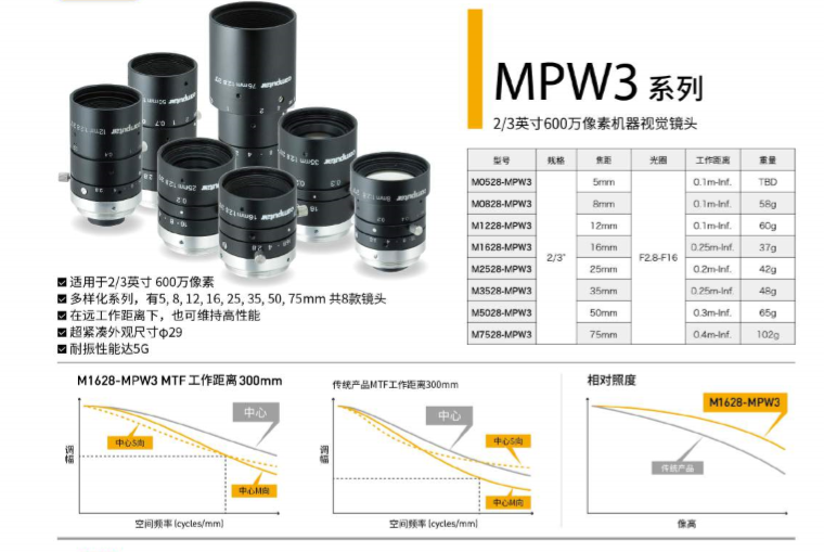 日本CBC旗下Computar鏡頭發(fā)布新款MPW3系列機(jī)器視覺鏡頭,該鏡頭最大支持2/3英寸靶面同時(shí)具有600萬像素,共有8款型號(hào)選擇(5mm、8mm、12mm、16mm、25mm、35mm、50mm、75mm),在外觀及功能上具有緊湊型&輕量化、低畸變、超短工作距離、視場(chǎng)亮度均勻等特征,匹配在IMX250、IMX264、IMX178、RJ3254、S3AA0DK、ICX625、EV2505M等芯片上,適用范圍:機(jī)器視覺、工業(yè)自動(dòng)化,智能交通,道路監(jiān)控等。