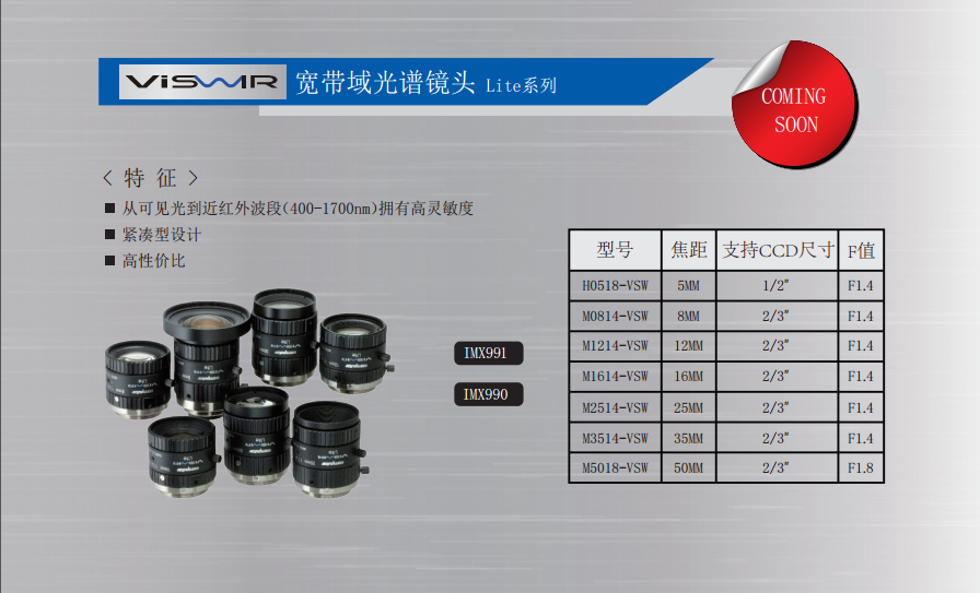 ViSWIR 鏡頭系列使用最新的可見光(Visible) +短波紅外(SWIR)傳感器提供高質(zhì)量的圖像。這款高性能鏡頭專為非可見光范圍成像而設(shè)計(jì),可將多種應(yīng)用應(yīng)用于多個(gè)市場(chǎng),包括半導(dǎo)體、農(nóng)業(yè)、醫(yī)療、遙感等。