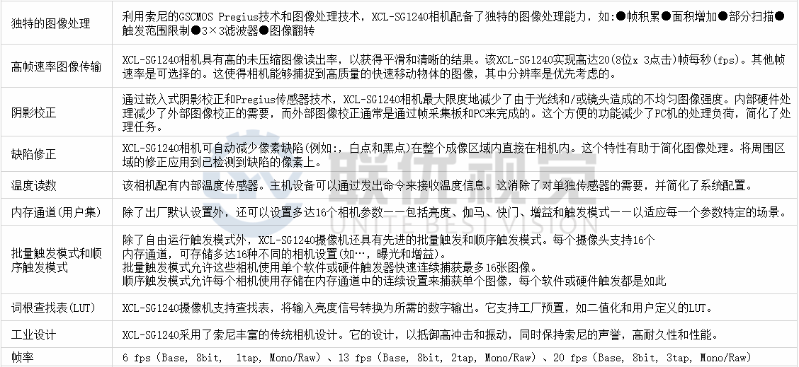 ●該XCL-SG1240(黑白)結(jié)合了索尼技術(shù)的最佳在一個方便的形式因素,這是優(yōu)化的工業(yè)視覺和非制造的視覺市場使用。