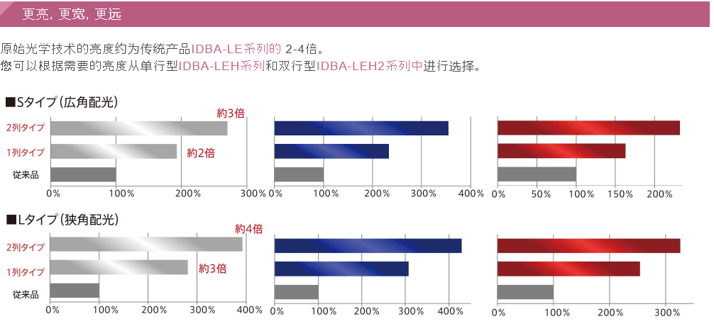 非常適合大型工件和遠距離輻射!新型條形照明采用獨特的光學(xué)技術(shù),可達到原始IDBA-LE系列產(chǎn)品的約3-4倍。可以在短距離內(nèi)照射大范圍的廣角配光S型和可以遠距離照射的窄角配光L型。2行IDBA-LEH系列具有高亮度。