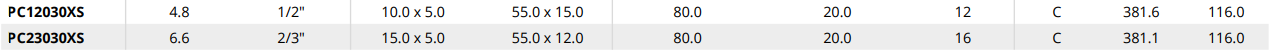 PC23030XS | 6.6 | 2/3" | 15.0 x 5.0 | 55.0 x 12.0 | 80.0 | 20.0 | 24 | 16 | C | 381.1 | 116.0 |